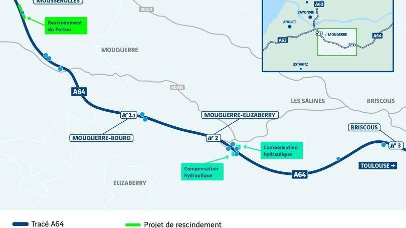 Lors de la mise aux normes de la section autoroutière de 2015 à 2016, une première phase de travaux a permis de créer le réseau de collecte des eaux de ruissellement. Le projet soumis à enquête publique s’inscrit dans la deuxième phase qui vient compléter ces premiers aménagements et finaliser la mise aux normes environnementale de l’autoroute A64. Il consiste en la création d’aménagements qui visent à diriger les eaux de ruissellement vers des nouveaux ouvrages (les bassins d’assainissement) en vue de leur traitement avant de pouvoir être rendues au milieu naturel et ainsi protéger l’environnement de la pollution engendrée par la circulation sur l’autoroute. 12 bassins d’assainissement multifonctions seront ainsi créés le long de l’autoroute A64 au niveau des communes de Mouguerre et Briscous.