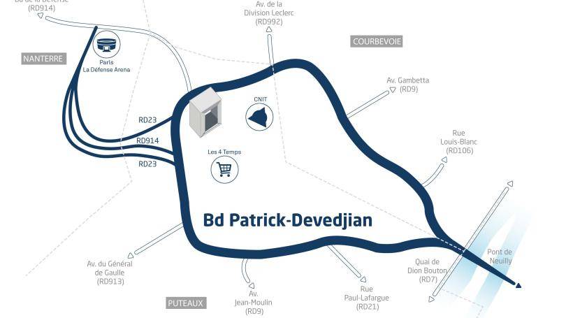 Ce projet porté par le Département, en partenariat avec Paris La Défense et les communes de Courbevoie, Nanterre et Puteaux, concerne la totalité de la boucle du boulevard Patrick-Devedjian, depuis le pont de Neuilly, ainsi que les connexions directes, principalement les RD 914, RD 21, RD 23. Il vise non seulement à accueillir toutes les mobilités, mais aussi à devenir un nouveau lieu de vie et d’échanges.